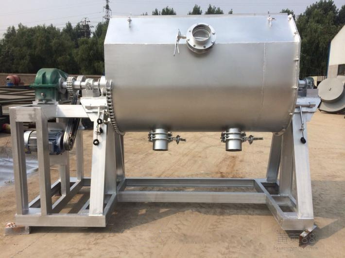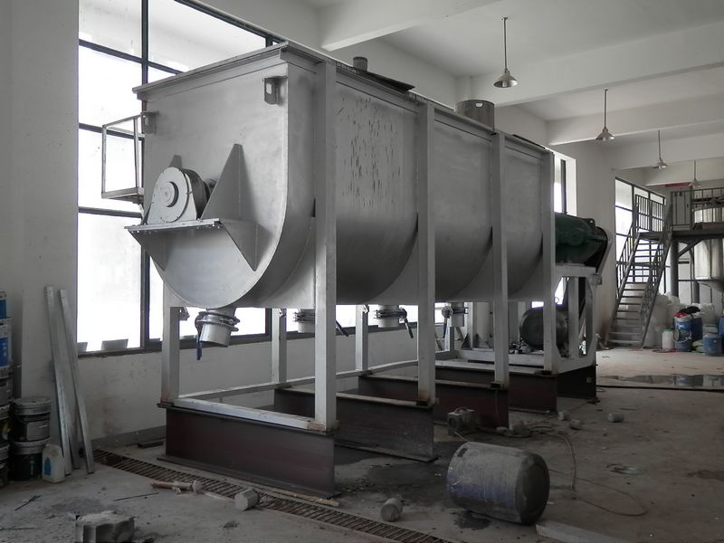 本產品采用U型外觀設計,內部采用雙層螺帶設計。即在水平的主軸上裝有兩條或多條輸送能力相同,螺徑不同,螺轉方向不同的螺帶。通常是當主軸轉動時,一條螺帶把物料從左至右輸送,另一條螺帶把物料從右至左輸送。因而在機內發生對流穿插混合作用,達到混合均勻的目的。
